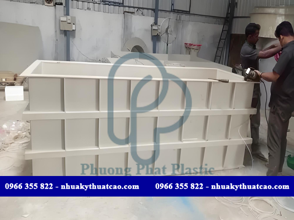 - Gia công kết nối bằng các công cụ hàn chuyên dụng đãm bảo được độ kín, có thể hấp thụ các lực tác động do đặc tính của nguyên liệu gia công thành bể chứa hoá chất.